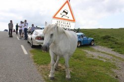 Petit arrêt obligatoire au Col du « Chioula » ou un troupeau de chevaux «Mérens » avaient temporairement obturé la route pour notre plus grand bonheur. Les mécaniques ont durant cet intermède soufflées un peu... Le repos pour tout le monde fut de courte durée. Le col le plus haut de l’Ariège attendait les vaillantes Alpine et Renault Sportives. C’est avec grand élan que certains ont abordé les épingles qui montent vers la station de ski d’ Ascou-Pailhères avec le point culminant du Col de « Pailhères » à 2001mètres. Là aussi un grand attroupement de Mérens s’étaient donné rendez-vous pour voir passer la caravane multicolore et accessoirement bloquer la route. Ce petit arrêt allait refroidir mécaniques et pilotes qui voulaient en découdre pour une demi-journée bien remplie.