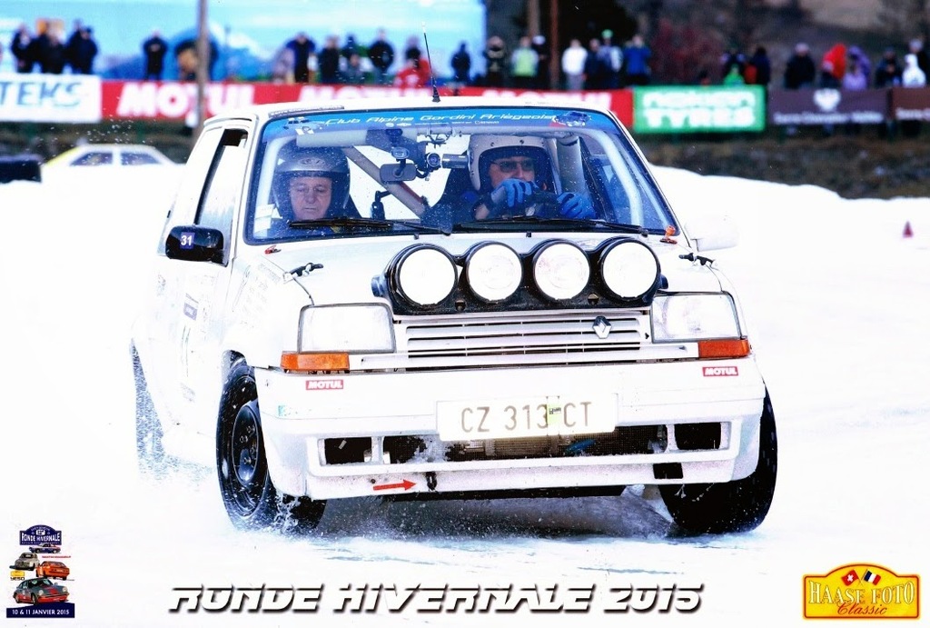 Pour nos 3 manches d’Endurance il y avait seulement 5 autos 2 roues motrices dont notamment nos préférées ‘’R5GT’’et les 25 autos 4x4... ! Nicolas (l’animateur circuit) a laissé cette année le DIAC pour l’épargner et est venu avec une 5GTTurbo blanche équipée de super pneus crampons cloutés pour le rdv pris en 2014 avec GG et on n’a pas manqué de se retrouver dans les mêmes manches...
