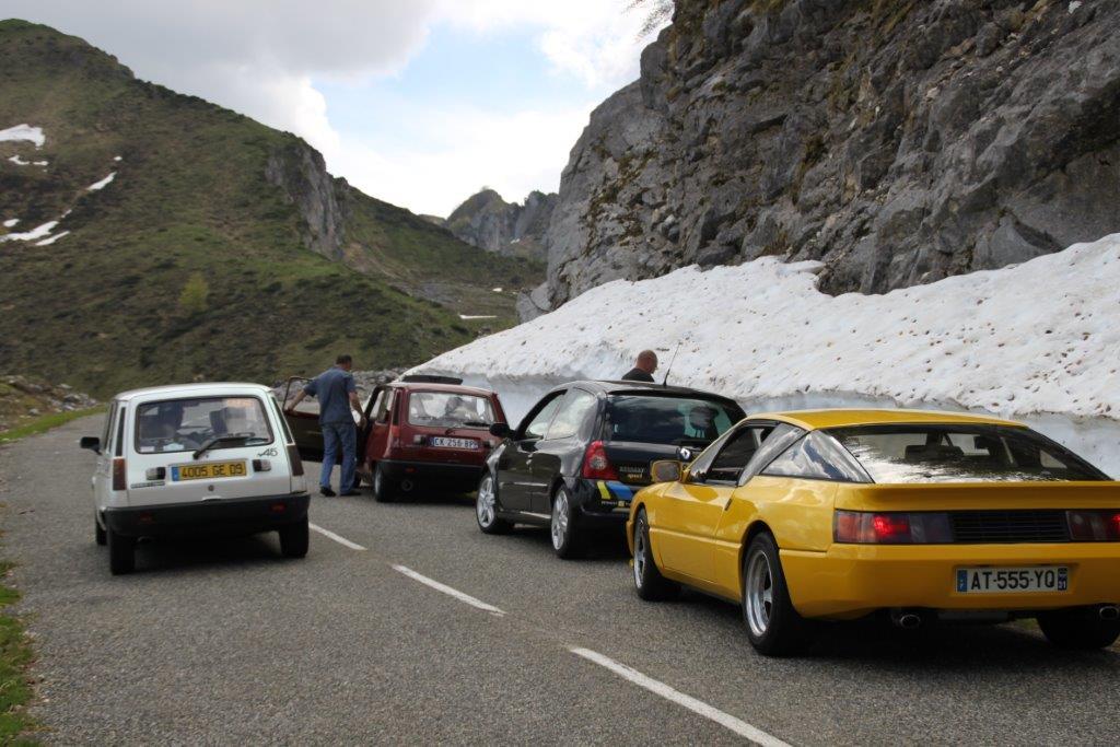 Au Km 140,600 du rood-book, nous voilà face au mur qui monte vers le mythique « plateau de Beille ». Seize kilomètres nous séparent de l’arrivée de cette première étape. C’est la R8 Gordini rutilante de Jean-Denis qui emboite le pas sur un petit peloton formé de l’A310 4 cylindres de Patrick, Mégane RS red bull de Gérard, A310 V6 de Bernard suivi de la GTA de Fred, le tout chassé par la Clio V6. Après quelques attaques sur notre doyenne qui résistera balayant toute la route et parfois les bas-côtés jusqu’au sommet. La Clio V6 n’a pas résisté à lécher le pare-chocs arrière de la belle R8G, ce qui a permis à Marie de faire quelques belles photos de notre cinquantenaire qui nous a prouvé toute sa vivacité et surtout son agilité menée par son fervent pilote et courageuse co-pilote. Depuis les 1800mètres d’altitude du plateau de Beille les premières arrivées surveillent avec attention ce petit train. Nous noterons un gros coup de chaud pour la 5 GT turbo de Laurent qui a un peu poussé sa mécanique dans ses derniers retranchements dans la montée de Beille.