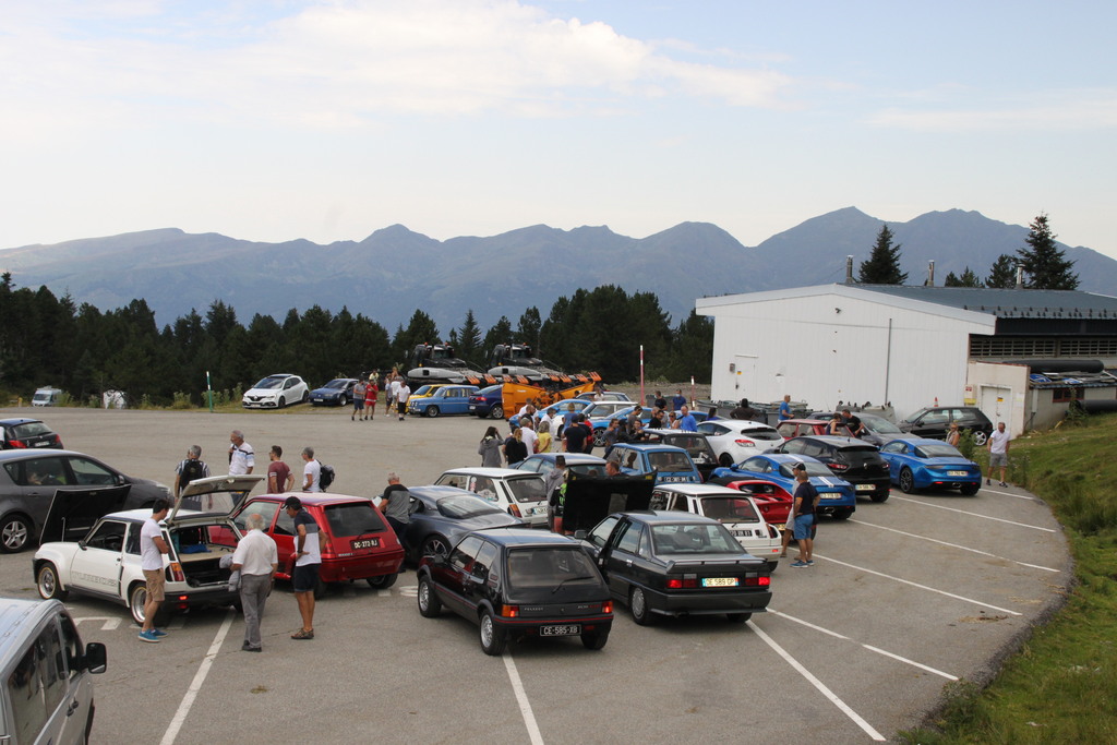 La pendule du clocher affiche 10 heures, la température extérieure commence à monter et l’envie des concurrents est grandissante… Après un départ toute les 30’’, nous allons après quelques tours de roues nous trouver rapidement dans le vif du sujet.. C’est l’ascension du col de Port qui culmine à 1250m dans le massif de l’Arize. Une petite halte au sommet afin d’en apprécier le point de vue sur la vallée et un ralentissement obligé pour tous lors de la descente avec la rencontre d’un grand troupeau de vaches.. (chacun à bien retenu le partage de la route lors du briefing) Après la traversée encombrée du village de Massat, nous devons rouler vers le beau village d’Oust et monter le Col d’Agnes situé à 1570m. Ce dernier se trouve entre Aulus- les- Bains et le Port. Nos organisateurs nous ont offert un magnifique tracé en contournant de toute part l’Etang de l’Hers situé 1264m d’altitude sur la commune du Port dans l’Ariège. L’occasion pour certains de faire une halte rafraichissante avant d’arriver au point de rassemblement sur les hauteurs de Vicdessos où nous attendaient Yvan et Finette. Pause bien méritée pour les personnes et mécaniques…Point de vue magnifique où les névés sont encore présents au-dessus de 2000m. Cette phase intermédiaire entre neige et glace que l’on apercevait au loin a ravivé l’ensemble de notre caravane…C’est en convoi quelques peu éparpillé que nous avons rejoint le village de Vicdessos pour prendre la route qui monte en Andorre. Ce n’est pas fini pour autant car il nous reste l’ascension vertigineuse du plateau de Beille, lieu de quelques sévères empoignades entre quelques audacieux participants qui s’en sont donné à cœur joie sur cette belle et large montée fatidique au coureurs du Tour de France. Lieu magique à 1800m d’altitude, les mécaniques vont enfin faire une grande pause avec une température extérieure de 21 degrés. Après cette petite période de canicule nous voilà tous requinqués. C’est une grillade de vaches élevées sur le plateau par la célèbre maison « Lacube » ambassadeur Ariègeois du goût, qui attend les 80 convives. C’est sur la terrasse extérieure face aux Pyrénées Espagnoles que nous prenons place. Après les plats de charcuterie maison, c’est autour des grillades accompagnées de patates nouvelles à volonté que chacun a été servi, fromage local et croustade maison viennent clôturer cette belle journée. C’est déjà le moment de nous quitter, moment ponctué par quelques gouttes de pluies venues rafraichir la descente vers la vallée. L’occasion de remercier une nouvelle fois Yvan et Finette qui ont comme à leur habitude assuré grave..