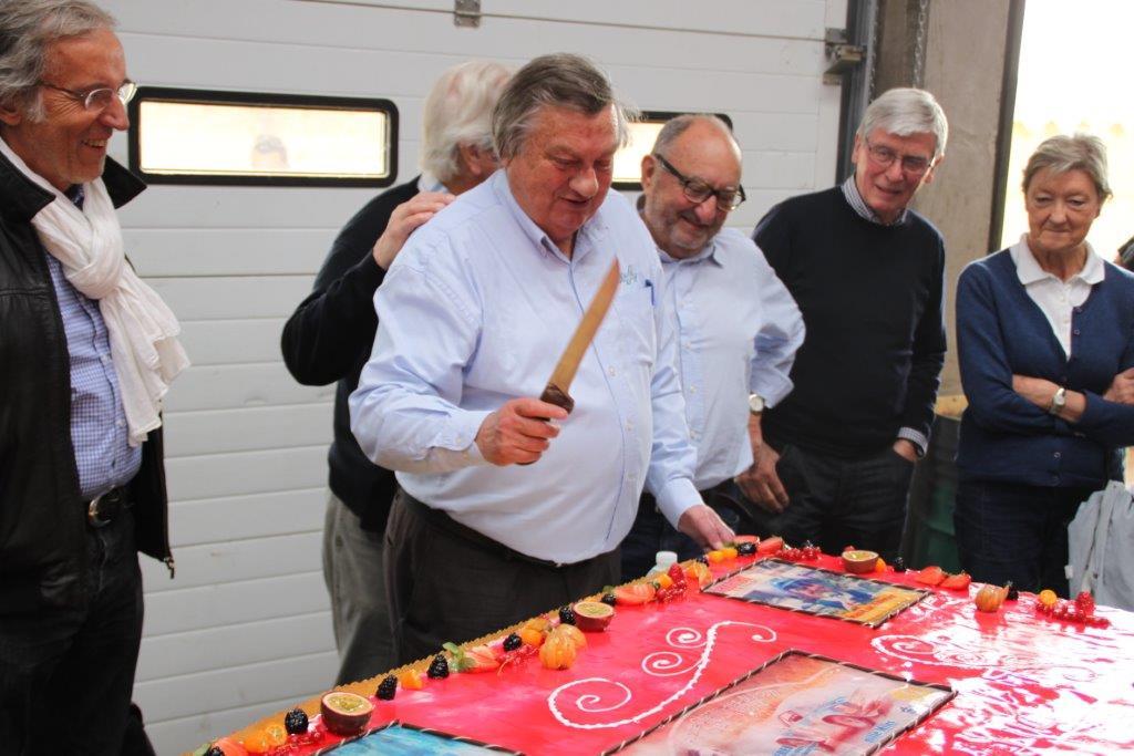 Chacun prend place après avoir été servi par l’équipe de Jacky dans une partie de l’atelier où trône sur une estrade le magnifique gâteau décoré en l’honneur de Jean-Luc Thérier.