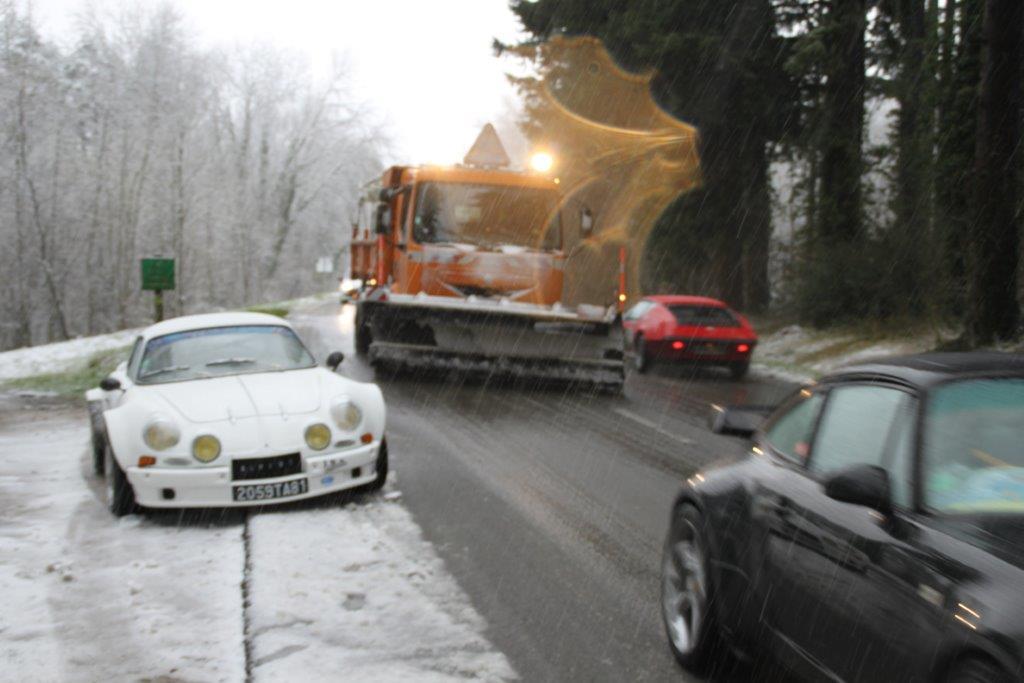 Petit café et croissant allaient réchauffer les équipages. Le temps également d’apprécier la primeur Gaillacois de notre Ami Olive. Vin nouveau qui s’est légèrement refroidi dans la Berlinette du propriétaire. La saucisse Aveyronnaise a aussi été très appréciée.