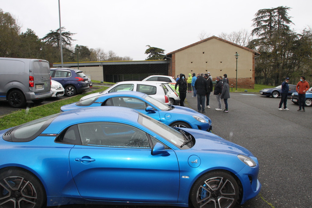 Du fait que chacun ait reçu quelques jours auparavant le parcours afin de limiter le contact , nous avons plus ou moins étudié le tracé… Notre lieu de rendez-vous pour le pic-nic étant fixé à Rennes-le-château tout petit village situé dans le département de l’Aude, ou le mystère du trésor des Templiers nous a tous un peu émoustillé… Mais avant de retrouver la capitale du Razès et peut être le divin trésor, nous devons rallier dans un premier temps le département de l’Ariège. Nos organisateurs n’ont pas manquer d’imagination en nous faisant passer à Mazères devant l’ancien siège du CAGA. Dix-huit ans de rencontres et de belles histoires d’Alpine et Renault sportives ce sont écrites dans ce lieu !!! C’est à présent la Citadelle de Mirepoix, Chalabre, Puivert et Espéraza qui est dans notre ligne de mire. C’est au bout d’une bonne dizaine d’épingles à cheveux que nous découvrons perché sur ce piton au cœur de la vallée de l’Aude : Rennes le Château. Nous avons malgré nous amené également les bourrasques de vents et de pluies depuis la banlieue Toulousaine…. Casquettes clouées sur nos têtes et enfoncées jusqu’aux oreilles dans nos blousons nous franchissons les nombreuses marches qui nous conduisent à l’entrée du site. Au fil de la visite notre ami Bernard qui a participé avec son R 5 Alpine Turbo commence à nous raconter la fascinante histoire que renferme cet étrange village…Un véritable guide que nous ne soupçonnions pas jusqu’à présent. Bernard nous raconte l’histoire d’un prêtre Béranger Saunière arrivée en 1885 jusqu’à 1917. Ce dernier n’a pas uniquement rénové l’église et le presbytère mais également acheté les terrains adjacents pour y construire la villa Béthanie, la Tour Magdala et la Tour de verre… Bernard nous intrigue par ces détails sur ce mystère qui grandit de minutes en en minutes sur le petit groupe CAGA . Notre ami nous confie qu’il venait régulièrement chez son arrière-grand-père Baptiste, Chapelier à Espéraza, à deux pas du magnifique site de Rennes et a participé aux recherches du dit trésor mais sans succès…C’est un petit nuage de petite grêle sans gravité pour nos carrosserie qui nous a délogé. Fort heureusement un parking sous abri nous permet de manger au sec. Merci encore à Bernard qui a improvisé la Renault 5 Alpine en buvette, faisant chauffer quelques casseroles d’eau sur le réchaud à gaz pour offrir un petit café à tous les équipages.. C’est sous cette note de convivialité que nous quittons notre parking pour reprendre la route vers Toulouse. Vers Limoux le soleil pointe enfin son nez et ne nous quittera plus jusqu’à notre arrivée. Un dernier arrêt à Villefranche de Lauraguais pour nous saluer et chacun est rentré avant le couvre-feu. Encore merci à Carine et JC pour ces 300km de roulage entre « Potes »