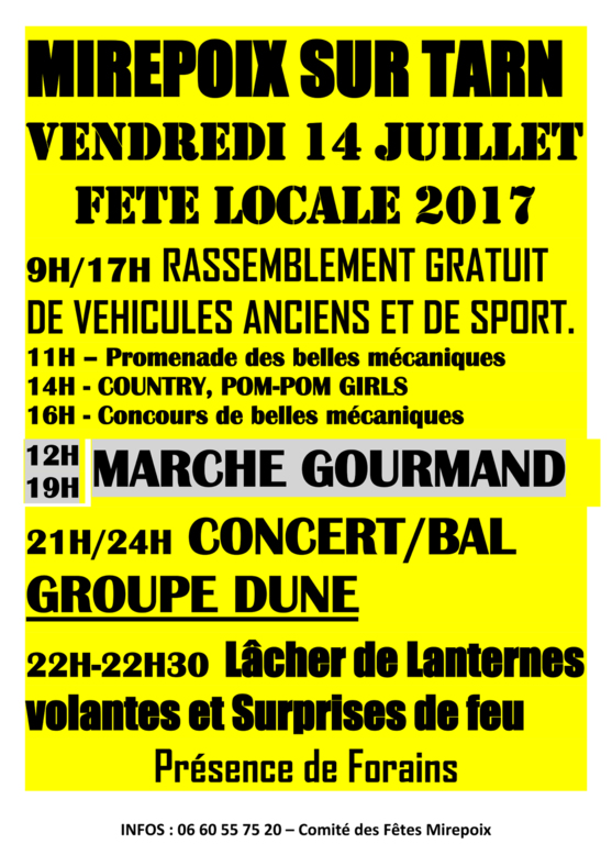Le 14 juillet à partir de 9h30, le Comité des fêtes de Mirepoix sur Tarn nous propose un rassemblement de véhicules avec de multiples animations (fête foraine, marché gourmand, petite balade, animation musicale toute la journée et le soir). 1 repas sera offert par Véhicules exposé. Envoyez directement vos inscriptions via le bulletin ci-joint en précisant que vous faites partie du CAGA. A bientôt !